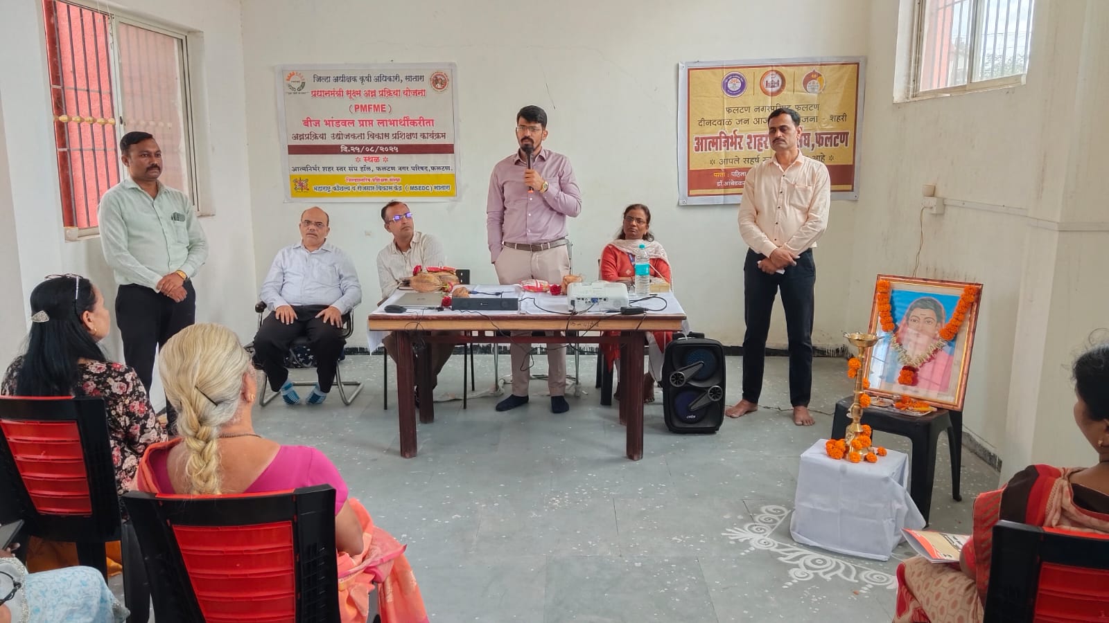 पंतप्रधान सूक्ष्म अन्नप्रक्रिया योजनेअंतर्गत ज्या बचत गटातील महिलांना बीज भांडवल प्राप्त झाले आहे अशा महिलांकरिता एक दिवसाचे प्रशिक्षण आत्मनिर्भर शहर स्तर संघ , फलटण नगरपरिषद फलटण येथे आयोजित केले होते. या कार्यशाळेमध्ये जिल्हास्तरीय मुख्य प्रशिक्षक श्री लीनेश निकम यांनी विविध लघुउद्योगांची माहिती सांगितली, शासनाच्या विविध योजनांची सविस्तर माहिती दिली, उत्पादनाचे पॅकेजिंग कसे असावे, त्याचे मार्केटिंग कशाप्रकारे करावे , अन्नसुरक्षा मनाचे व त्याचे महत्त्व या सर्व विषयांवर चित्रफितींद्वारे मार्गदर्शन केले. या योजनेमधून ज्या महिलांना लोन व सबसिडी मिळाली आहे व ज्यांचे उद्योग यशस्वीरित्या उभे आहेत अशा उद्योजिका महिलांचे सुद्धा मार्गदर्शन आयोजित करण्यात आले होते. यामधून महिलांना प्रेरणा मिळवून त्या उद्योग उभारणीस प्रवृत्त होतात. सर्व विषय महिलांनी समजून घेऊन त्यावर प्रश्नोत्तरे सुद्धा झाली व भविष्यामध्ये अन्न प्रक्रिया उद्योग उभा करण्याचा निर्धार केला. या प्रशिक्षण कार्यक्रमासाठी एकूण 50 महिला उपस्थित होत्या. या कार्यक्रमांमध्ये जिल्हा ग्रामीण विकास यंत्रणा याच्या फलटण विभाग प्रमुख सौ संजना आटोळे यांनी सुद्धा उपस्थित महिलांना मार्गदर्शन केले. उमेद विभागाच्या विविध योजनांची माहिती दिली. विभाग प्रमुख सौ. मनाली शेटे यांनी सुद्धा उपस्थित महिलांना मार्गदर्शन केले. सदर कार्यक्रमाचे आयोजन करण्याकरिता श्री शिंदे, श्री शिरतोडे, शहर अभियान व्यवस्थापक व सौ विद्या रिठे, व्यवस्थापक यांनी विशेष प्रयत्न केले. सर्वांचे आभार मानून कार्यक्रमाची सांगता झाली.