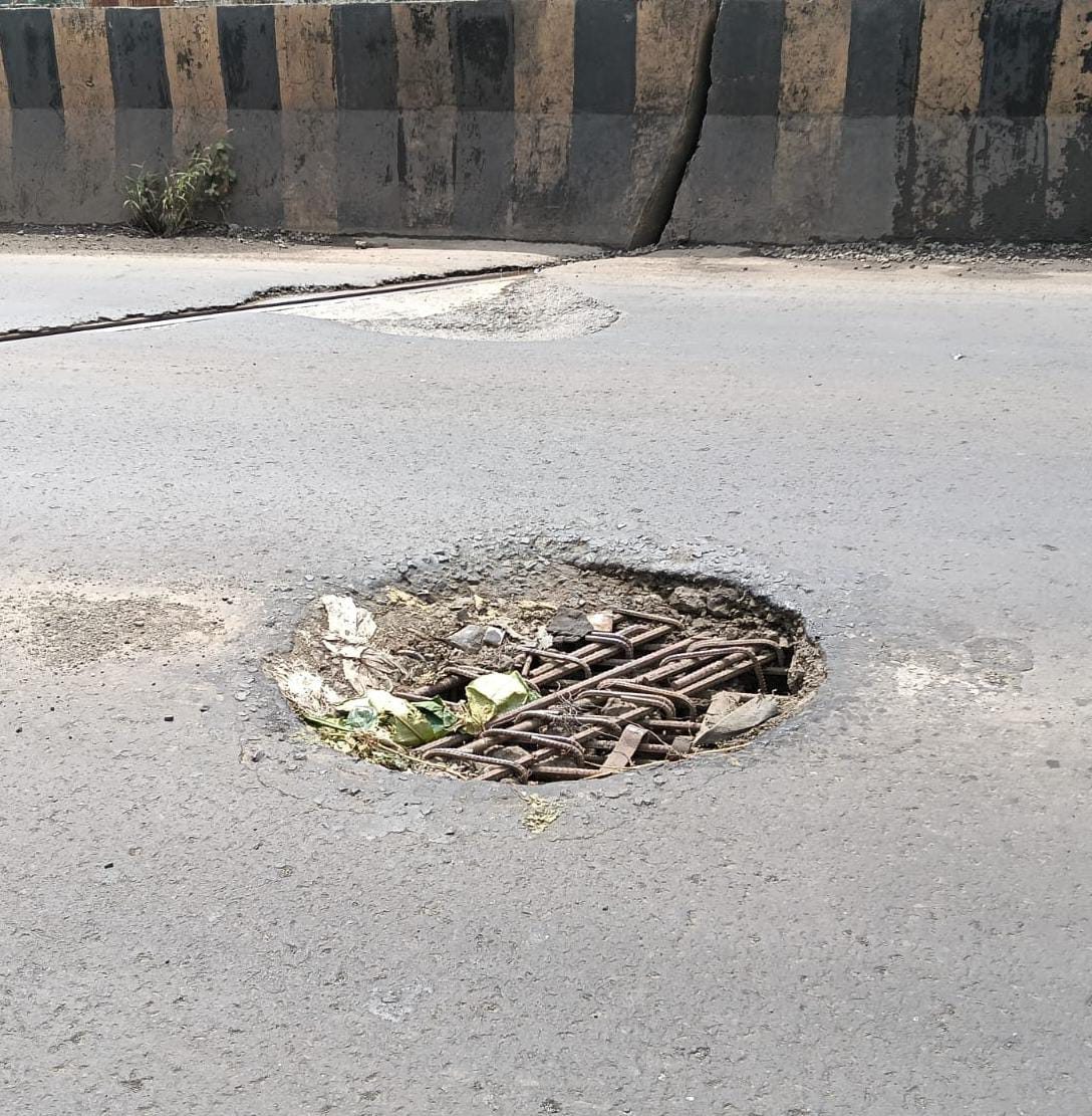 तळेगाव रेल्वे उड्डाण पुलावर रस्त्याच्या मधोमध मोठा खड्डा, अपघात होण्याची वाहन धारकांना भीती