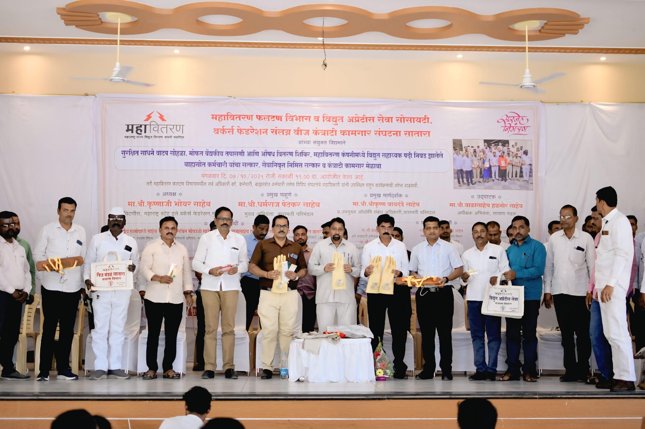 महावितरण कंपनी सातारा सर्कलमधील फलटण विभागांमध्ये काम करणाऱ्या कंत्राटी कामगारांना महावितरण फलटण विभाग , विद्युत अप्रेंटिस सेवा सोसायटी व वर्कर्स फेडरेशन संलग्न वीज कंत्राटी कामगार संघटना सातारा यांच्या वतीने दिनांक ७ ऑक्टोबर २०२५ रोजी सूर्याची गार्डन मंगल कार्यालय फलटण येथे कॉम्रेड कृष्णा भोयर सरचिटणीस महाराष्ट्र स्टेट इलेक्ट्रिसिटी वर्कर्स फेडरेशन , श्री श्रीकृष्ण वायदंडे साहेब प्र. मुख्य औद्योगिक संबंधित अधिकारी बारामती झोन , फलटण विभागाचे कार्यकारी अभियंता श्री प्रदीप ग्रामोपाध्ये साहेब , अतिरिक्त कार्यकारी अभियंता श्री सचिन मोकाशी साहेब , मा. डॉ. श्री भारत नागरे साहेब ESIC दवाखाना फलटण यांच्या अध्यक्षतेखाली व महावितरण मधील सर्व अधिकारी , कर्मचारी यांच्या उपस्थितीमध्ये कंत्राटी वीज कामगारांना सुरक्षा साधनांचे वाटप, मोफत वैद्यकीय तपासणी व औषध वितरण शिबिर तसेच महावितरण कंपनीमध्ये विद्युत सहाय्यक पदी निवड झालेल्या बाहयस्तोत्र कामगाराचा सत्कार, जे कंत्राटी कामगार सेवानिवृत्ती झालेले आहेत त्यांचे सपत्नीक सत्कार व कंत्राटी कामगारांचा मेळावा आयोजित करण्यात आला होता.