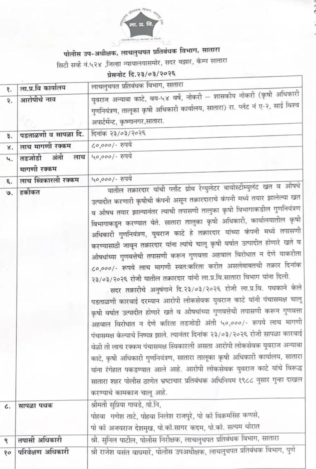 साताऱ्यात कृषी अधिकाऱ्याला ५० हजारांची लाच घेताना रंगेहात पकडले March 24, 2026 No Comments Read More »